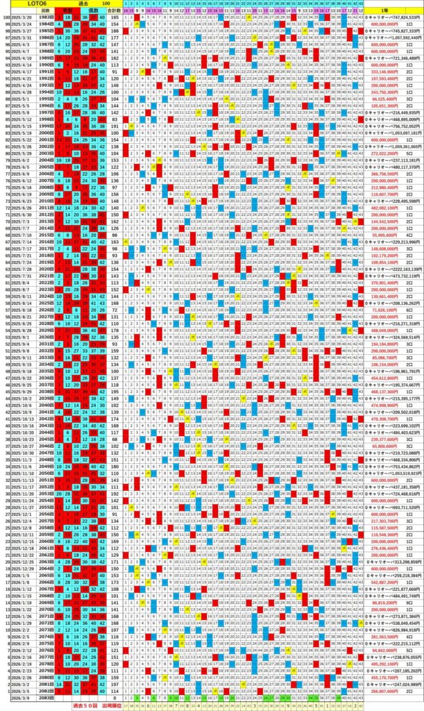 ロト6 【ロト6】狙いやすい過去51回・100回データ! 次回2083回(R8.3.9 月) 当選出目を予想!