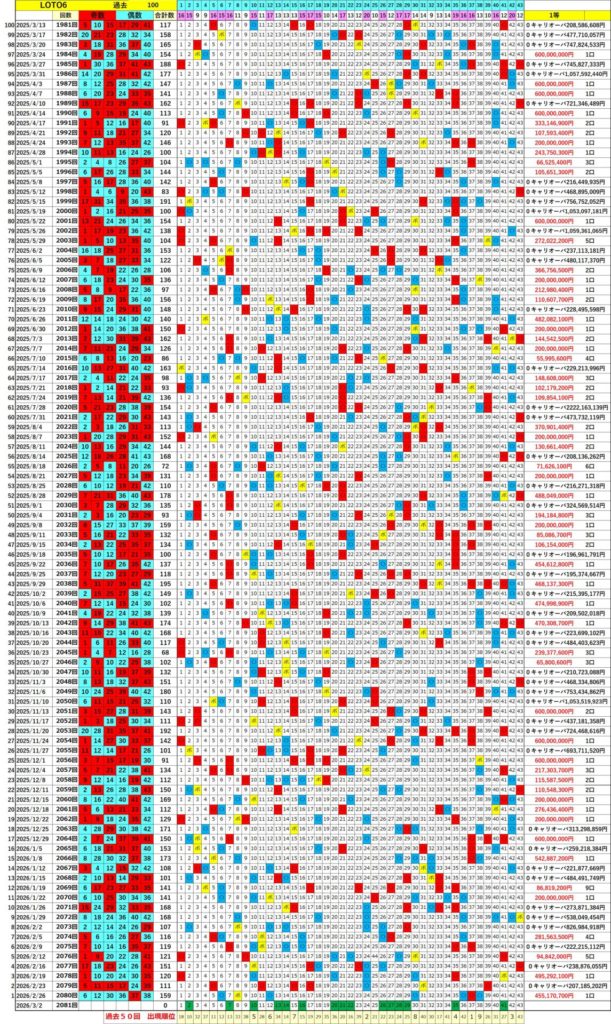 ロト6 【ロト6】狙いやすい過去50回・100回データ! 次回2081回(R8.3.2 月) 当選出目を予想!