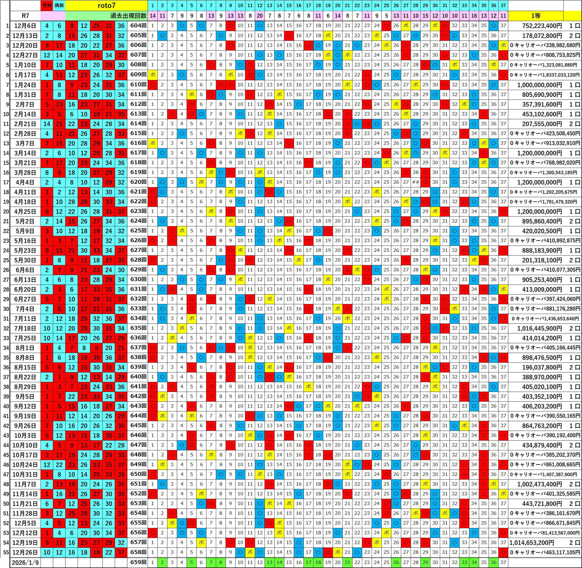 | 50 | R7/12/26 | 658回 | ⑪⑳ | 10 | 12 | 16 | 18 | 19 | 22 | 37 | 0 463,117,105円 |